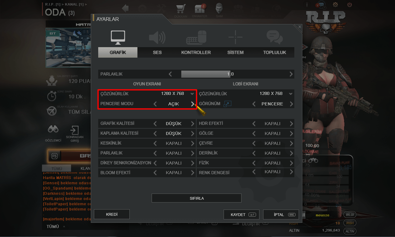 Pencere Modu: Açık olacak şekilde istediğiniz çözünürlükte oynayabilirsiniz.